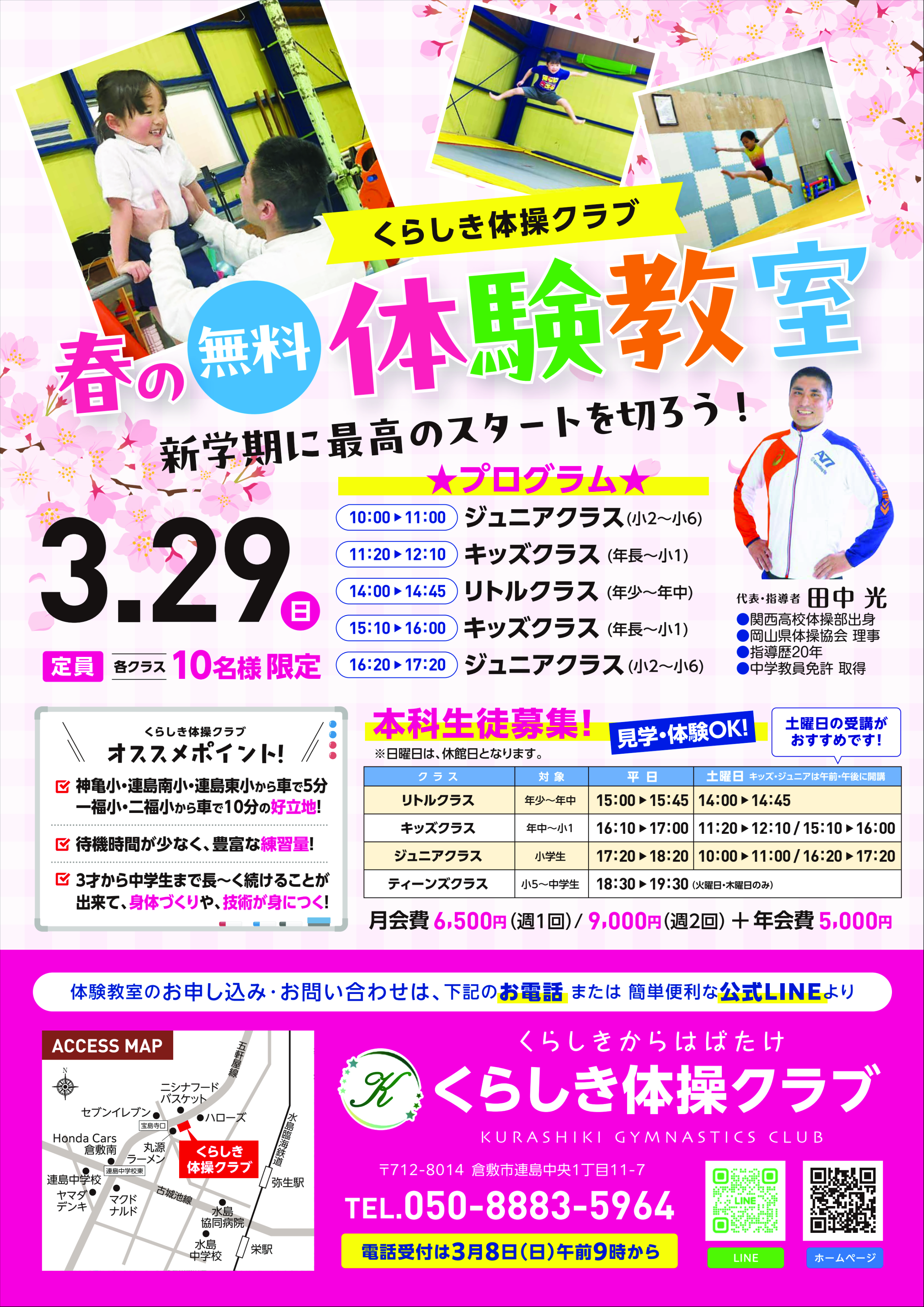はじめまして。代表の田中です。2020年3月に1度閉館した福田体操クラブをこの度くらしき体操クラブへとリニューアルしました。